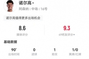 诺尔高本场1助攻+9长传7成功 2造犯规2解围2拦截4抢断 获评8.6分
