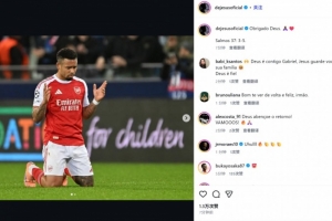 复出击中门框!阿森纳前锋热苏斯社媒晒比赛照纪念:感谢上帝