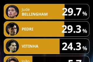 环足奖最佳中场投票:贝林厄姆居首,佩德里、维蒂尼亚前三