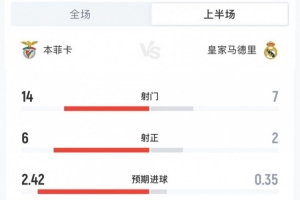 下一篇: 本菲卡2-1皇马半场数据:射门14-7射正6-2,控球率37%-63%