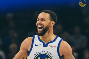 赛后勇士发布赢球海报,封面为库里大笑瞬间。