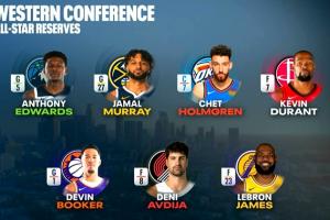 西部全明星替补:华子、切特、穆雷、布克、阿夫迪亚、杜兰特、詹姆斯。