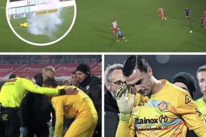 “具体而言,在下半场开场几分钟后,客队球迷区投掷出一个大鞭炮,并在克雷莫内塞门将附近爆炸。该门将随即倒地并表现出明显的眩晕状态,主裁判因此暂停了比赛,以便医疗人员进场救治。”