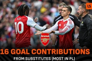 阿森纳替补球员本赛季参与16球英超第一,曼城替补仅2球倒数第一